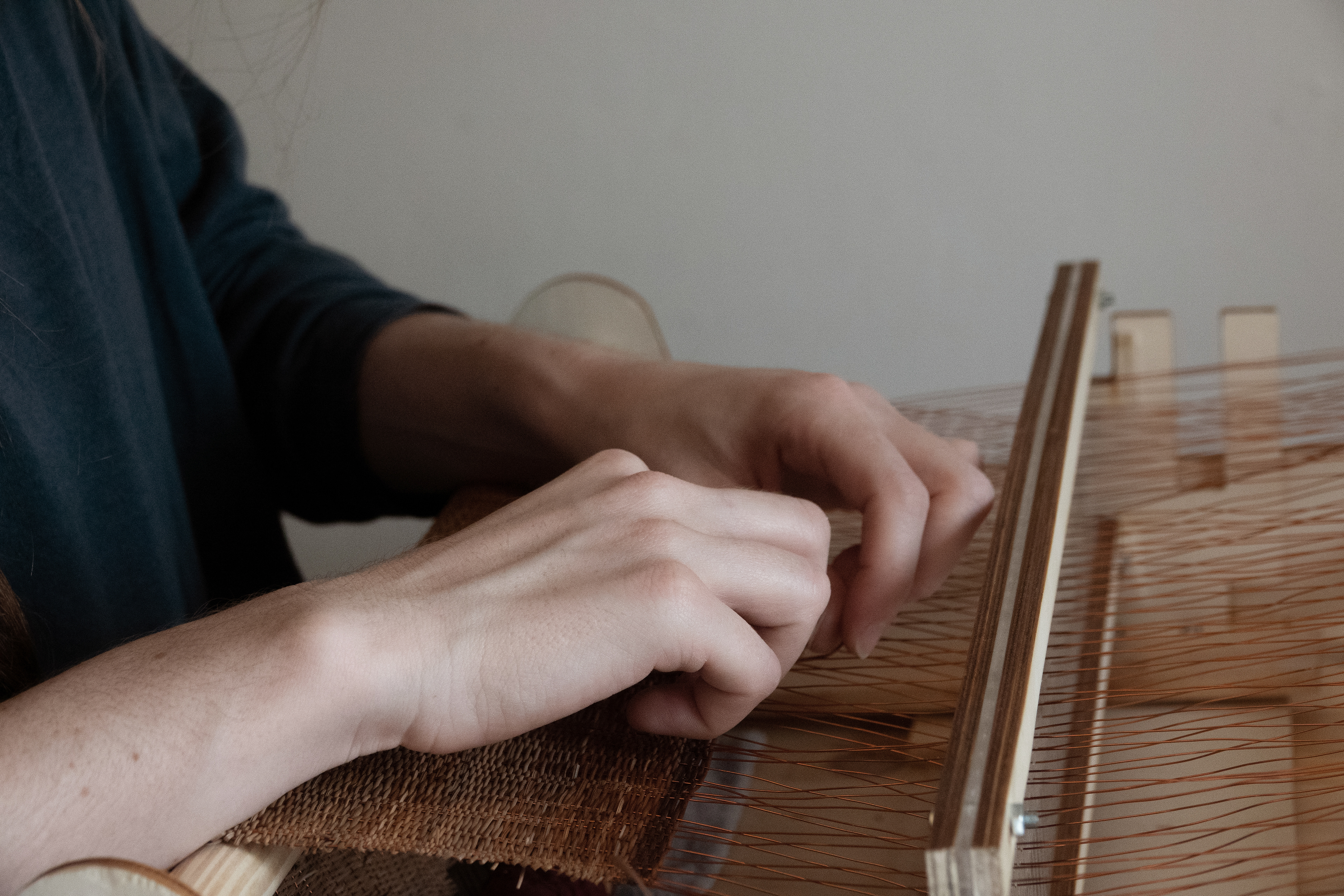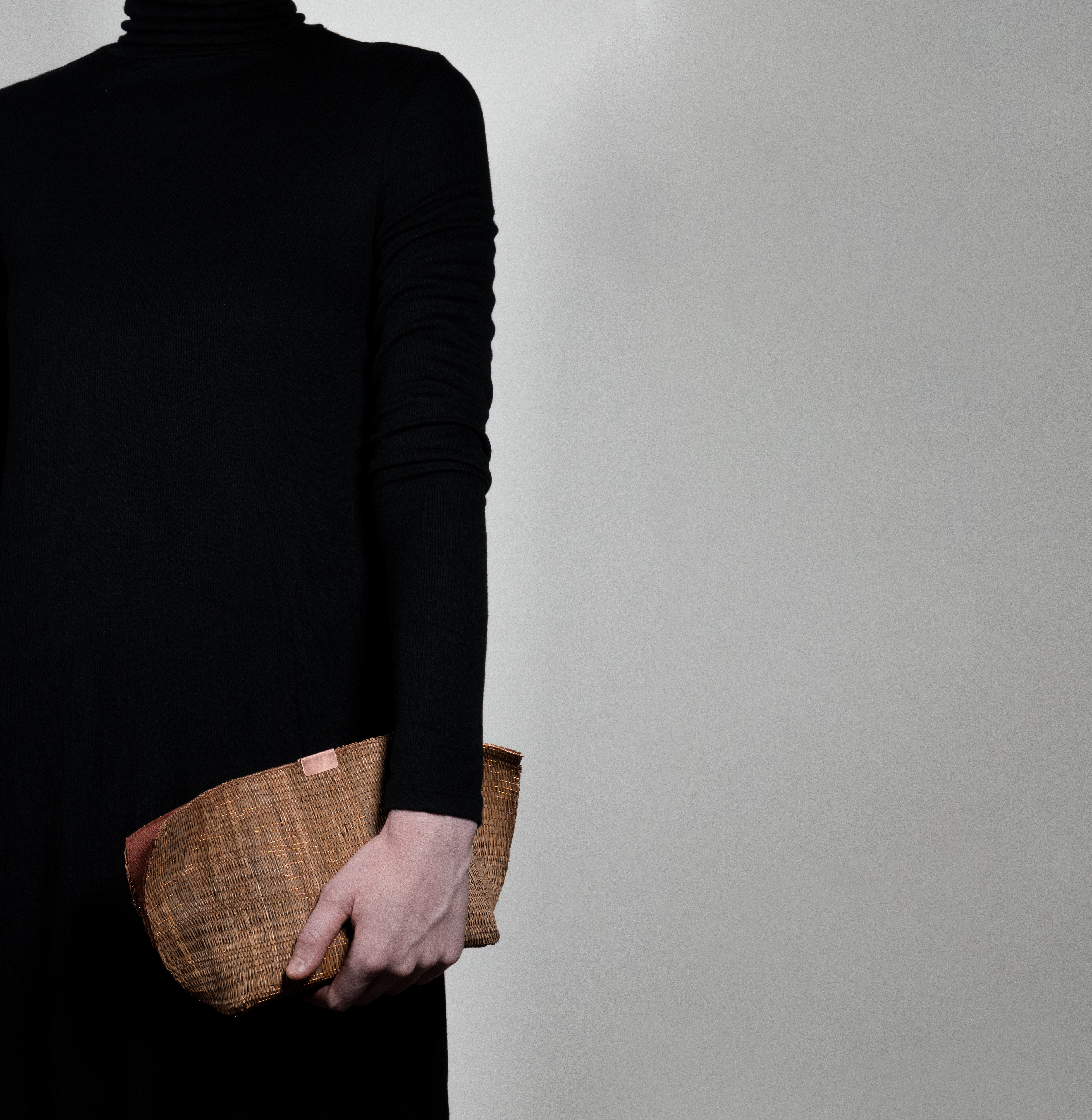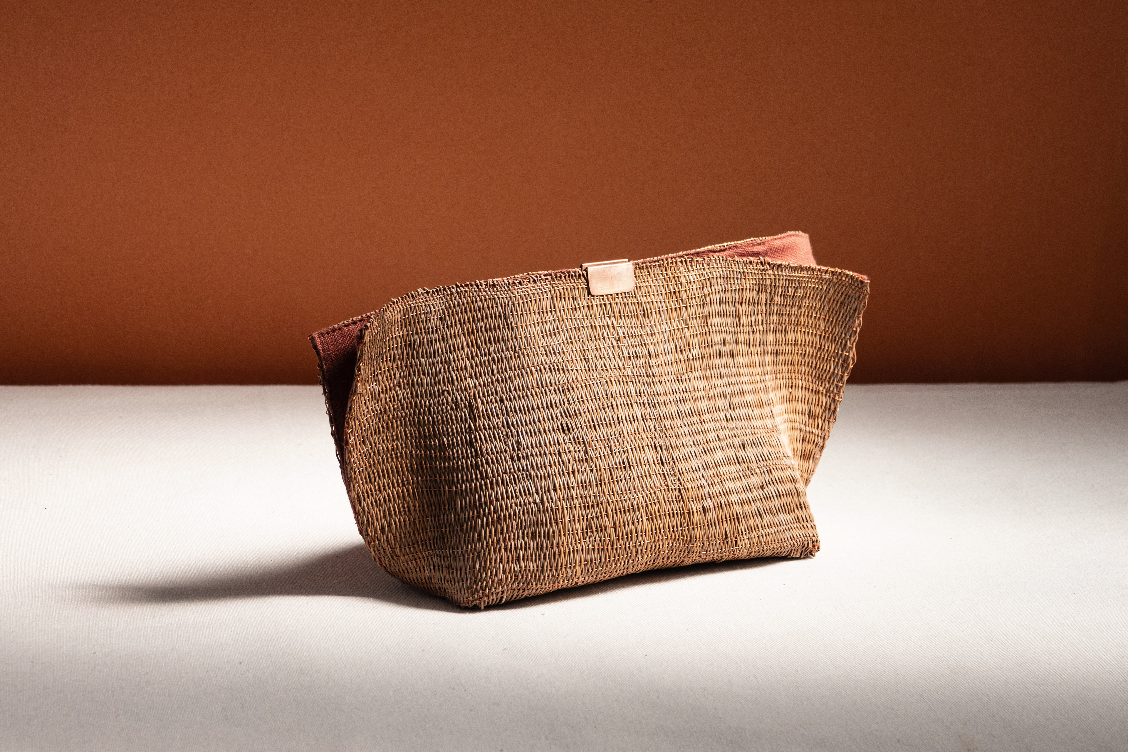 Copine is the outcome of experimentation with two materials: Leftover copper wire and natural pine needles, which both have antiviral properties in the search of a new textile. A dedicated loom was built to execute this novel weaving technique, creating a constructive yet flexible textile with a shiny natural look. The clutch bag was created with one pre-planned sheet of woven material with no excess or waste.